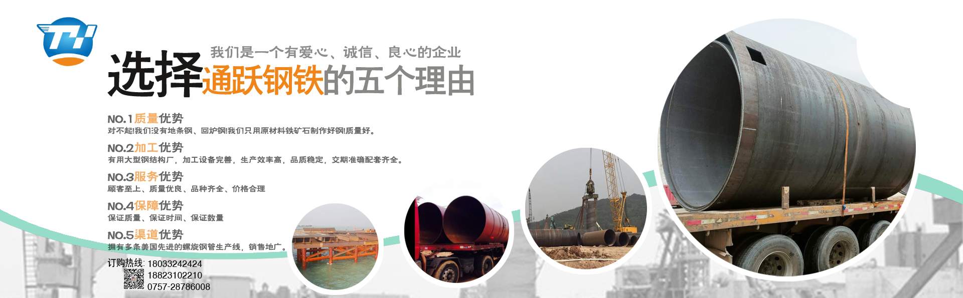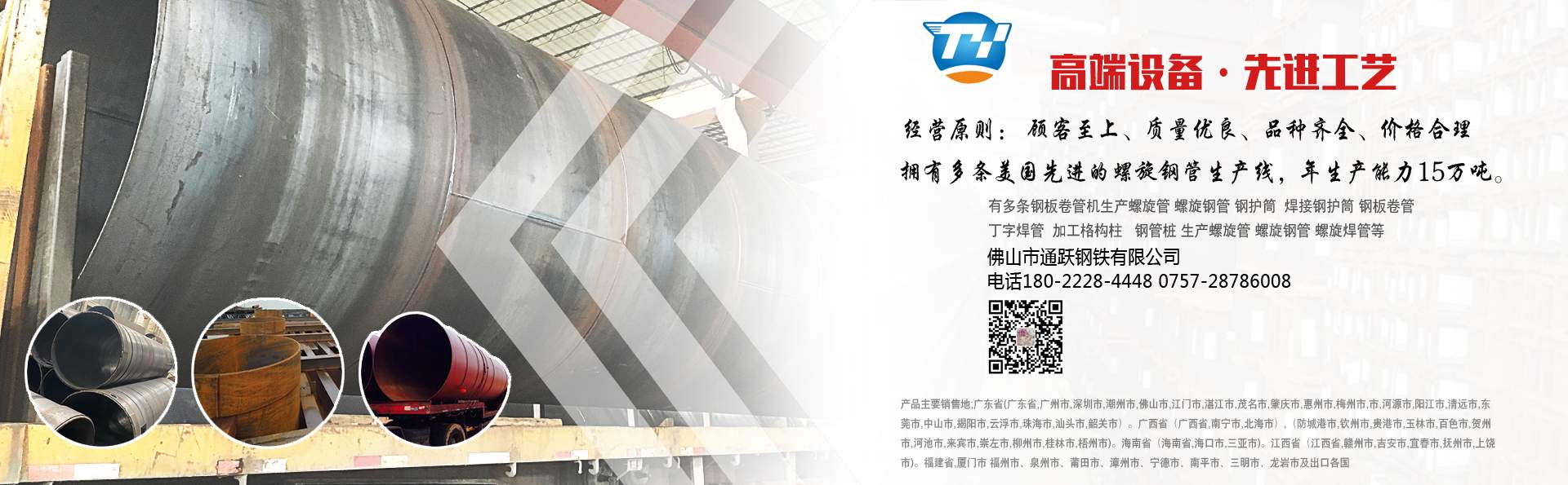 佛山市通躍鋼鐵有限公司 電話180-2228-4448 0757-28786008 擁有多條美國先進的螺旋鋼管生產(chǎn)線,生產(chǎn)直徑φ159-φ3620mm(壁厚6mm-20mm)的雙面埋弧螺旋焊鋼管,年生產(chǎn)能力15萬噸。 生產(chǎn)螺旋管 螺旋鋼管 螺旋焊管 規(guī)格厚度6mm-20mm 直徑159mm-3620mm 有多條鋼板卷管機生產(chǎn)規(guī)格厚度6mm-70mm 直徑400mm-5020mm 螺旋管 螺旋鋼管 鋼護筒 焊接鋼護筒 鋼板卷管 丁字焊管 加工格構柱 鋼管樁 材質(zhì)Q235B Q345B Q235A 45# 20# Q420D Q390··· ……
